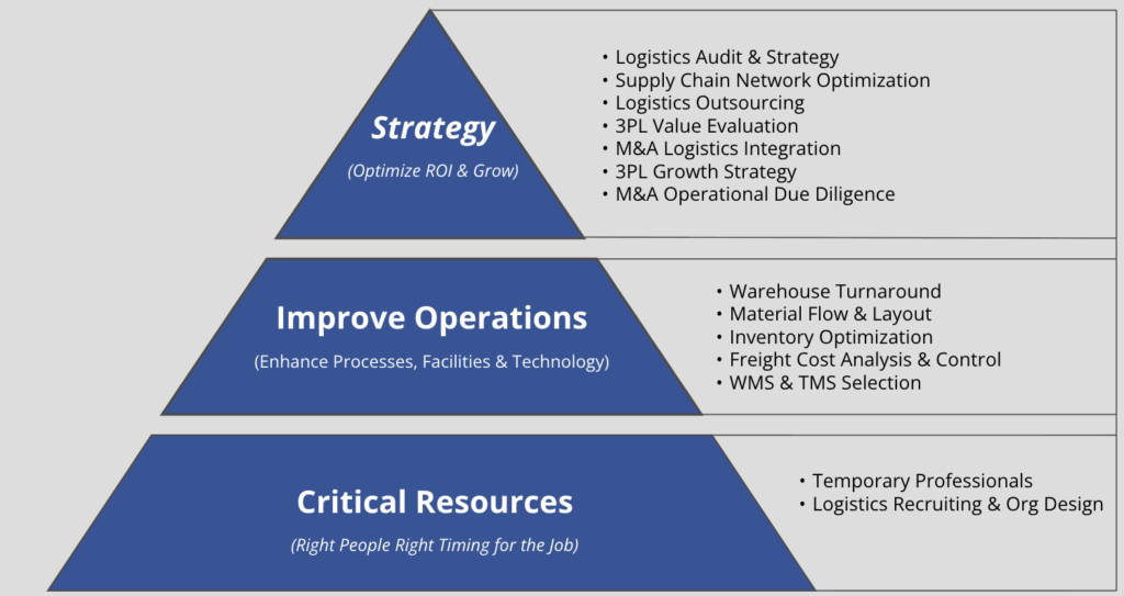 3PLR offers supply chain logistics consulting services and resource options to shippers (manufacturers, distributors & retailers), 3PLs (third-party logistics service providers ), and private equity companies. Our clients range from Small to Mid-sized Business (SMB) to Fortune 500.